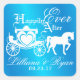 Conte de fée conception de cheval et de calèche en bleu paon, "heureux toujours après" avec le nom et la date du couple.