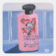 Impression artistique d'une bouteille de shampooing rose sur carrelage bleu.
