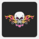 Un crâne méchant avec des crocs et des flammes et des coeurs de ceintures roses.