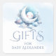Le design de la marque cadeau de baby shower est composé d'aquarelles bleues et grises croissant de lune, d'un visage de bébé abstrait et de nuages moelleux accentués par une élégante typographie rétro.