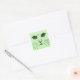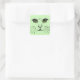 Cet autocollant carré est vert clair avec un croquis noir d'un visage de chat avec de longs murmures et des yeux verts intenses.