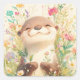 Sticker Carré Cute Baby Otter Smiling in Meadow Flowers