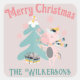 Cet autocollant de Noël personnalisé présente une illustration de dessin animé de style boho mignon et girly. Une jolie licorne rose orne son sapin de Noël sous des flocons de neige qui tombent. L'arrière - plan est de couleur rose pâle.