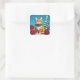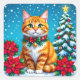 A whimsical orange cat with a polka dot collar with a jingle bell hanging from it, surrounded by poinsettias, a Christmas tree and snowflakes. Super cute to seal your Christmas cards with.