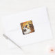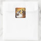 Un autocollant carré Halloween présente un graphique assisté par IA d'un petit pug dans son costume de "Ghostie" pour la tournée des friandises avec une maison hantée en arrière-plan. Personnalisez avec votre propre message Halloween en texte incurvé en haut