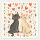Two cute cats, one dark and one light-colored sit happily beside each other surrounded by hearts and flowers in a retro design.