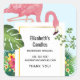 Professionnel merci autocollants avec un flamant rose mignon et capricieux. Entouré de feuilles tropicaux verts, de fleurs d'hibiscus rouges et jaunes. Un cadre de dégradé doré en forme de rectangle au centre.
