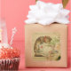 A cute vintage illustration of a cat drinking out of a giant tea cup. Within a collage of antique ephemera and pink roses.