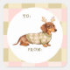 Célébrez la saison des fêtes magiques et festives avec nos autocollants de fêtes illustratifs personnalisés. Notre design festif de vacances comprend notre chien de dachshund dessiné à la main et portant un chandail tricoté doux rose et vert olive. Le chien des dachshund porte des bois. Dispose d'un arrière - plan motif de damier qui complète magnifiquement l'illustration. Toutes les illustrations contenues dans cette aquarelle festive Joyeux autocollant de chien en dachshund Noël sont dessinées à la main par ©Moodthology.