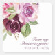 Autocollant floral pour mariage avec un bouquet de roses peintes à l'aquarelle prune, violettes et roses dans le coin supérieur gauche. À droite se trouve le message "De ma douche à la vôtre" et votre nom. Ces autocollants sont parfaits pour une célébration en automne et constituent un excellent moyen d'ajouter une touche personnelle à vos cadeaux.
