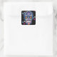 Cet autocollant carré présente mon style tatouage, le design coloré d'un crâne à sucre, sur un arrière - plan noir avec des fleurs, inspiré par Le Jour des Morts. Le crâne à motifs très pointus présente des fleurs orange dans les prises de vue et un design traditionnel sur le front. Les couleurs dominent le bleu orange, le rose et le blanc.