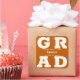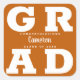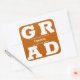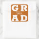 GRAD en lettres blanches grasses remplit les coins de ces autocollants carrés de diplômé sur fond orange brûlé. Félicitations au-dessus du nom de votre diplômé et la promotion en dessous. VOIR TOUTE LA COLLECTION de combinaisons de couleurs prêtes à l'emploi, invitations, assiettes en papier, serviettes, pancartes et plus encore dans notre magasin.