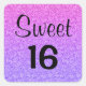 Un autocollant doux 16 carré avec une parties scintillant violette à l'ombre brillante brille arrière - plan et une écriture noire audacieuse.