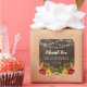 Carré merci autocollant avec coins arrondis pour un mariage d'été tardif, mariage rustique, mariage de grange, ou mariage campagnard. Le Merci est écrit en calligraphie doucement brillante sous des rangées de lumières à cordes. Vos noms et votre mariage datent dans une police charmante, rustique, haute et étroite, et en dessous, fleurs d'automne et verdure : tournesols, roses rouges et oranges, baies et feuilles.