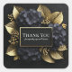Make a powerful statement of modern luxury with this stunningly elegant floral thank you sticker. The design features a deep, textured black background, creating a dramatic and sophisticated canvas with a subtle shimmer. A beautiful arrangement of lush, 3D-style flowers, including deep indigo-black hydrangeas, peeks out from behind a central frame. The bouquet is dominated by large, brilliant, brushed metallic gold leaves and delicate gold berry sprays, which add a rich, high-end, and artistic feel. A chic, clean black rectangular frame with a minimalist gold border provides a sophisticated focal point for your text. These stickers are perfect for a luxury brand's product packaging, sealing a high-end jeweler's gift box, a couture fashion boutique to add to shopping bags, or for sealing black-tie wedding or gala invitations. This versatile design can also be used to beautifully seal envelopes for any formal event, or as a sophisticated accent on high-end gift wrapping and party favors.