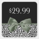 Des stickers tendance et chic pour motif animal pour votre boutique de mode avec un empreinte de léopard moderne noir et blanc et un élégant ruban vert foncé attaché à un arc élégant. Personnalisez en ajoutant votre propre prix de vente. Image imprimée plate, pas le ruban réel.