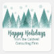 Une élégante rangée de sapins d'hiver et de flocons de neige au-dessus de votre script Happy Holidays personnalisé et de votre nom d'entreprise dans un beau vert turquoise sous la forêt enneigée. Un accessoire cadeau de vacances d'entreprise moderne avec votre message personnalisé sur des autocollants d'entreprise jolies et festives pour le marketing client.