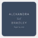 This elegant wedding sticker features a clean, modern design with a deep navy blue background and crisp white text. The layout is minimalistic, showcasing two names in a sophisticated serif font, connected by a stylish cursive "and," followed by a date in a smaller serif type. The generous spacing between elements emphasizes clarity and focus, creating a serene and refined atmosphere perfect for a significant personal celebration. Ideal for couples seeking a classic yet contemporary look, this sticker combines simplicity with sophistication to mark their special day.