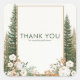 Bring the serene beauty of the forest to your correspondence with this elegant rustic sticker. The design features a clean, off-white background framed by a minimalist, thin bronze-gold border. Flanking the sides are two beautifully illustrated, tall pine trees, rendered in realistic shades of deep forest green. At the base, a lush, painterly arrangement of creamy white peonies and garden roses blooms amidst rustic, rust-orange filler flowers and rich green foliage. This sophisticated blend of evergreen forest elements and delicate white florals creates a unique and timeless woodland aesthetic. These stickers are perfect for businesses that evoke nature, rustic charm, and elegance, such as wedding planners specializing in woodland or mountain themes, boutique florists, fine art photographers, artisanal craftspeople, or rustic event venues and lodges. This versatile design can also be used to beautifully seal envelopes for weddings, holiday greetings, or formal events, or as a sophisticated accent on party favors and gift wrapping.