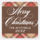 Le design des autocollants de vacances présente un cadre élégant et préppy tan, brun, rouge et blanc à motif tartan avec un design personnalisé Merry Christmas monogramme qui peut être personnalisé avec votre nom de famille et l'année.