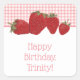 Créez des autocollants personnalisés pour les fêtes d'anniversaire ou toute occasion. Ces autocollants sont prêts à être customisés avec votre propre texte et disposent d'une bordure rose en vichy et d'illustrations de style réaliste de fraises rouges mûres. Votre message est dans la coordination des lettres roses.