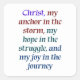 Espoir et joie dans le Christ : "Christ, mon ancre dans la tempête, mon espérance dans la lutte, et ma joie dans le voyage" Cette citation signifie que, au milieu des défis et des incertitudes de la vie, le Christ apporte stabilité et force.
