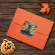 Une fée aux ailes orange et jaune sur des marches en pierre qui mènent peut-être au royaume des Fées. La Fée afro-américaine n'est pas seule, elle est avec son chien doberman gardien ce jour d'automne.