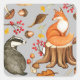 L'autocollant d'automne sur le thème des bois présente du renard et du blaireau avec des feuilles, des baies, des champignons et des glands sur arrière - plan gris clair.