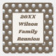Personnalisez vos enveloppes de réunion de famille, pages de cahiers ou affiches avec cet autocollant carré peu coûteux. Le motif à points polka présente des cercles argentés contre un arrière - plan brun foncé. Un grand rectangle au centre est décoré de tons marron et beige et fournit un solide arrière - plan pour vos informations de réunion personnalisées. Customisez rapidement et facilement l'année et votre nom de famille.