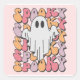 Ce design d'Halloween amusant et festif présente une illustration fantôme classique avant et centre, entourée du mot "Éffrayant" répété dans une police audacieuse et mousseuse. Le texte est superposé à des couleurs vibrantes et d'inspiration rétro, comme des roses douces, des violets et des oranges, créant un contraste ludique avec la simple silhouette blanche du fantôme. Les yeux noirs sans expressivité du fantôme apportent une touche de charme étrange, tandis que la typographie ondulée et empilée donne au design une atmosphère super et nostalgique.