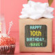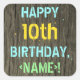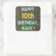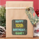 Ce design amusant d'autocollant sur le thème de l'anniversaire comporte un message comme "HAPPY 10th BIRTHDAY,<NAME>!", où le nom peut être personnalisé. L'arrière - plan présente un motif rustique, brun, imitation bois de grain. Le texte du message personnalisable est composé de couleurs comme le bleu, le jaune et le vert, et il a un aspect inspiré de celui du lettrage peint et recouvert de pochoirs. Des autocollants comme ceux-ci pourraient peut-être être offerts en cadeau, ou être utilisés comme décorations lors d'une fête d'anniversaire organisée pour quelqu'un qui célèbre son dixième anniversaire. [~Z0000296]