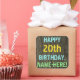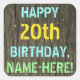 Ce design amusant d'autocollant sur le thème de l'anniversaire comporte un message comme "HAPPY 20th BANTHDAY, NAME-HERE !", où le nom peut être personnalisé. L'arrière - plan présente un motif rustique, brun, imitation bois de grain. Le texte du message personnalisable est composé de couleurs comme le bleu, le jaune et le vert, et il a un aspect inspiré de celui du lettrage peint et recouvert de pochoirs. Des autocollants comme ceux-ci pourraient peut-être être offerts en cadeau, ou être utilisés comme décorations lors d'une fête d'anniversaire organisée pour quelqu'un qui célèbre son vingtième anniversaire. [~Z0000296]
