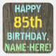 Ce design amusant d'autocollant sur le thème de l'anniversaire comporte un message comme "HAPPY 85th BIRTHDAY, NAME-HERE !", où le nom peut être personnalisé. L'arrière - plan présente un motif rustique, brun, imitation bois de grain. Le texte du message personnalisé présente des couleurs comme le bleu, le jaune et le vert, et il a un aspect inspiré de celui du lettrage peint et recouvert de pochoirs. Des autocollants comme ceux-ci pourraient peut-être être offerts en cadeau, ou peut-être être utilisés comme décorations lors d'une fête d'anniversaire organisée pour quelqu'un qui célèbre son quatre-vingt-cinquième anniversaire. [~Z0000296]