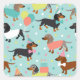 Chiens de fête d'anniversaire mignons avec des manteaux noirs, bronzés et dapple habillés de mignonettes vêtements d'anniversaire avec ballons, gâteau et motif confetti.