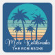 Ce mignon sticker hawaïen de Noël présente un coucher de soleil tropical sur un arrière - plan bleu cool avec un dessin de palmiers côtiers contre un coucher de soleil en bord de mer. Personnalisez avec votre nom en écriture blanche sous Mele Kalikimaka en typographie cursive sur ces jolis autocollants de vacances familiales.