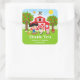 Cet autocollant mignon et amusant présente une fille aux cheveux noirs avec une peau claire à côté d'une grange rouge avec une girouette coq. Il y a des animaux de ferme adorables tels qu'une vache, un cochon et une poule. En arrière-plan, on voit un ciel bleu vif, des pommiers, la lumière du soleil, des papillons et des marguerites. Le texte combine des polices grasses et sans serif pour un look stylé et moderne. C'est parfait pour une fête d'anniversaire sur le thème de la ferme.