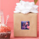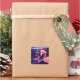 Cet autocollant tropical de Noël de plage de Bonnes Fêtes présente un flamant rose portant un chapeau de Père Noël rouge et blanc. Il y a des lampes à cordes festives et un arbre de Noël Ribbon et Stars. -