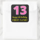 Ce joyeux autocollant carré sur le thème de l'anniversaire présente un grand numéro "13", avec un motif rose foncé et rayures rose clair. Il comporte également le message "Joyeux 13e anniversaire", et un nom personnalisé. L'arrière - plan est noir de couleur. Des autocollants amusants et personnalisés comme celui-ci peuvent être donnés comme cadeau d’anniversaire, ou utilisés lors de l’emballage de cadeaux ou de cadeaux, ou peut-être utilisés comme décoration de fête d’anniversaire pour célébrer le 13e anniversaire de quelqu’un. [~Z0000578]