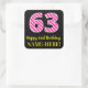 Ce joyeux autocollant carré sur le thème de l'anniversaire comporte un grand numéro "63" avec un motif rose clair et rose foncé rayures, avec le message "Happy 63ème anniversaire", et un nom personnalisé. L'arrière - plan est noir de couleur. Des autocollants amusants, gais et personnalisés comme celui-ci peuvent être donnés comme cadeau d’anniversaire, utilisés lors de l’emballage de cadeaux ou de cadeaux, ou peut-être utilisés comme décoration de fête d’anniversaire pour célébrer le soixante-troisième anniversaire de quelqu’un. [~Z0000578]