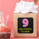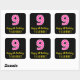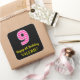 Ce joyeux autocollant carré sur le thème de l'anniversaire comporte un grand numéro "9" avec un motif rose foncé et rose clair rayures, avec le message "Happy 9th Birthday,", et un nom personnalisé. L'arrière - plan est noir de couleur. Des autocollants amusants et personnalisés comme celui-ci peuvent être donnés comme cadeau d’anniversaire, ou utilisés lors de l’emballage de cadeaux, ou peut-être utilisés comme décoration de fête d’anniversaire pour célébrer le neuvième anniversaire de quelqu’un. [~Z0000578]