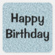Glam Happy Anniversaire autocollant carré avec une parties scintillant argent bleu clair scintille l'arrière - plan et l'écriture noire audacieuse. Parfait pour une fête d'anniversaire !