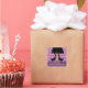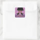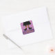 Ces autocollants d'Halloween amusants présentent une robe noire de sorcière avec des jambes vêtues de bas rayés orange et noir et ses chaussures noires pointues avec des boucles orange. L'Arrière - plan est un motif de cercles violets. Texte ci-dessous : "Bonne Halloween !" Art original d'Anne Coffey.