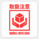 Le script japonais dit "toriatsukai-chuui", ce qui signifie "manier avec soin". Pratique lors de l'expédition d'articles fragiles au Japon. Idéal aussi pour les personnes qui visitent le Japon avec des instruments de musique qui nécessitent une manipulation soignée.