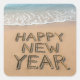 The words "Happy New Year" are beautifully etched into the sand of a pristine beach, as gentle waves caress the shoreline
