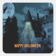 Le design thématique d'Halloween présente une peinture numérique artistique d'un manoir gothique hanté effrayant sur la colline avec un ciel bleu foncé et gris. Style de grunge personnalisable superposition de texte orange