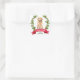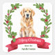 Sur ces autocollants de correspondance de vacances, un portrait d'un Golden Retriever est entouré d'une couronne de fraise rouge. En bas se trouve une bannière rouge avec votre salutation de Noël personnalisée, et votre signature est en vert sous elle.