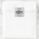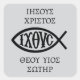 Ichthys or Ichtus Christian symbol. Fish outline with greek letters "ΙΧΘΥΣ". Custom background color. Top and bottom custom text fields.