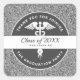Les Autocollants Carrés de Parties scintillant d'Argent Nurse sont modernes conçus avec arrière - plan de parties scintillant faux et bande horizontale grise sur le centre. Un symbole médical blanc est sur le centre gris. Le texte est "merci d'avoir rejoint la fête de remise des diplômes" courbé autour de l'image. Année de graduation customisée "classe de" et nom est en lettres de blocs gris mélangé avec des lettres de script de calligraphie. CLIQUEZ SUR L'OPTION PERSONNALISER LE MODÈLE ET ENTREZ LE NOM ET L'ANNÉE