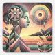 Graphisme abstrait coloré d'une femme ornée de fleurs, de soleil et d'étoiles, avec un effet aquarelle et des textures.