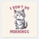 Commencez votre journée avec une touche d’humour et de félin avec cet autocollant "Je ne fais pas le matin" ! Dotée d'un chat gris endormi tenant une tasse de café, cette adorable oeuvre d'art est parfaite pour les amoureux de les chats comme pour les amateurs de café. Un cadeau délicieux pour toute personne qui n’est pas une personne du matin, ce design ajoute une touche ludique à votre quotidien.